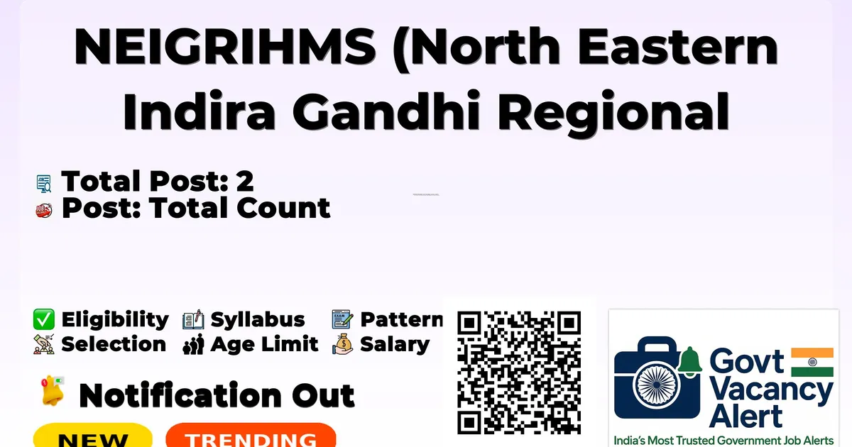 Company Name NEIGRIHMS (North Eastern Indira Gandhi Regional Institute of Health & Medical Sciences) Post Name Project Technical Support -III, Project Technical Support -I No of Posts 2 Salary ₹21,600/- to ₹33,600/- per month (inclusive of HRA) Qualification Graduate/PG in Social Work, Nursing, Public Health etc. Age Limit 28 to 35 years Date of Interview 29 December 2025 Official Website www.neigrihms.gov.in