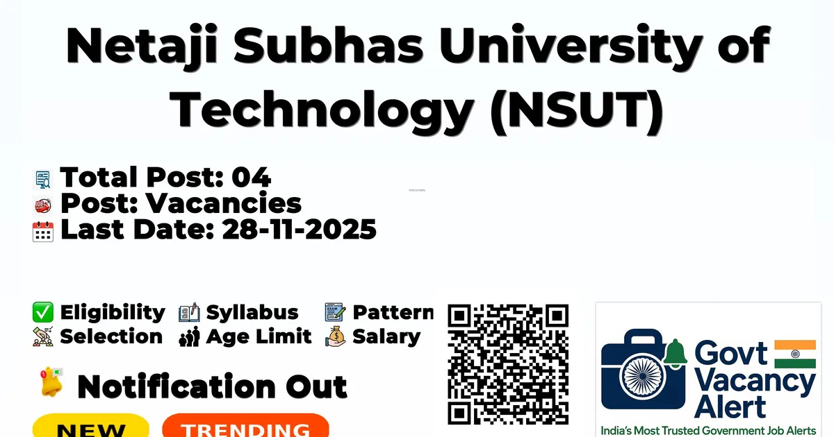 Company Name Netaji Subhas University of Technology (NSUT) Post Name Group A Officers No of Posts 04 Salary Rs. 57700-218100 Qualification B.Tech/B.E, Any Masters Degree, M.Sc, M.E/M.Tech, M.Phil/Ph.D, M.P.Ed Age Limit 35 to 60 years Start Date for Apply Online 24-10-2025 Last Date for Apply Online 28-11-2025 Official Website nsut.ac.in