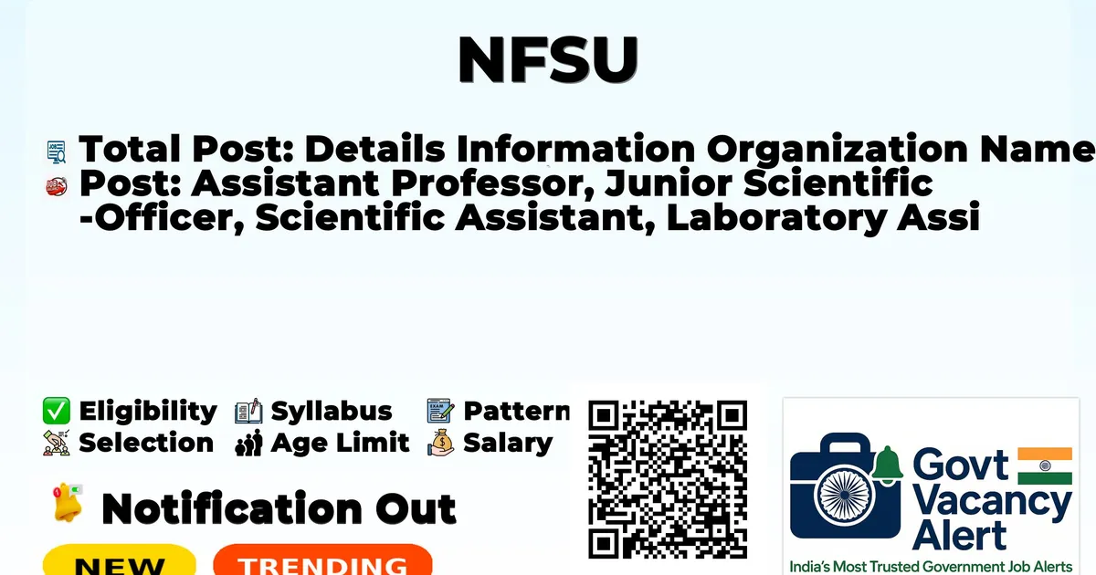 Details Information Organization Name National Forensic Sciences University (NFSU) Company Name in Short Form NFSU Post Name Assistant Professor, Junior Scientific Officer, Scientific Assistant, Laboratory Assistant, Research Assistant Notification Date 17 December 2025 Total Vacancy Count 13 Posts Advertisement Number NFSU_DC/2508/Admin/2025-26 Application Fee INR 500 + GST/- (Exempted for SC/ST/PwD) Maximum Age 30 to 35 years for specific non-teaching posts; Not specified for others Qualification Ph.D., Master's Degree, or Bachelor's Degree in relevant field (varies by post) Start Date 17 December 2025 (Advertisement Date) Last Date 25 December 2025 Walkin Date 29 December 2025 (Cyber Security posts) & 30 December 2025 (others) Official Website beta.nfsu.ac.in