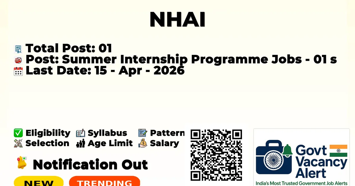 The National Highways Authority of India (NHAI) has officially released the notification to fill the vacancies of 01 Summer Internship Programme 2026 Posts. Interested and eligibile candidates can use this opportunity to apply for these posts before the last date of application. Candidates who have completed their B.E./B. Tech in Civil, Computer Science Engineering, Any Degree, and MBA can apply for the NHAI Notification 2026. The interested applicants can apply in online mode. Here we have mentioned the education details, age limit, selection process, application fee, salary, and how to apply for these posts before the deadline. The application dates have already begun.