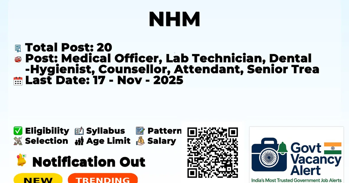 NHM — Medical Officer, Lab Technician, Dental Hygienist, Counsellor, Attendant, Senior Treatment Supervisor Jobs - 20 Posts