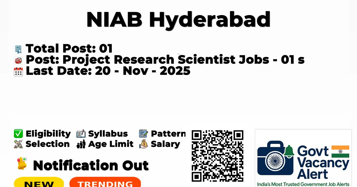 National Institute of Animal Biotechnology (NIAB) has declared the latest job notification for 2025. To fill up the vacancies for Project Research Scientist Jobs. Those candidates who have qualified in the Post-Graduation, M.Sc., can grab this chance and apply for the NIAB Recruitment 2025. Here, we include the age limit, selection process, salary structure, education details, application fee, and how to apply for these posts. Interested and eligible candidates can apply online before the last date.
