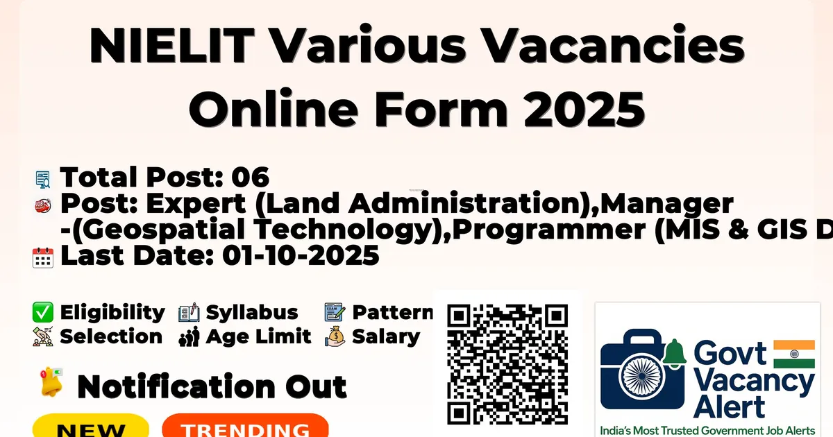 NIELIT Various Vacancies Online Form 2025 — Expert (Land Administration),Manager (Geospatial Technology),Programmer (MIS & GIS Developer),GIS Technical Expert,Remote Sensing Analyst,Data Entry Operator