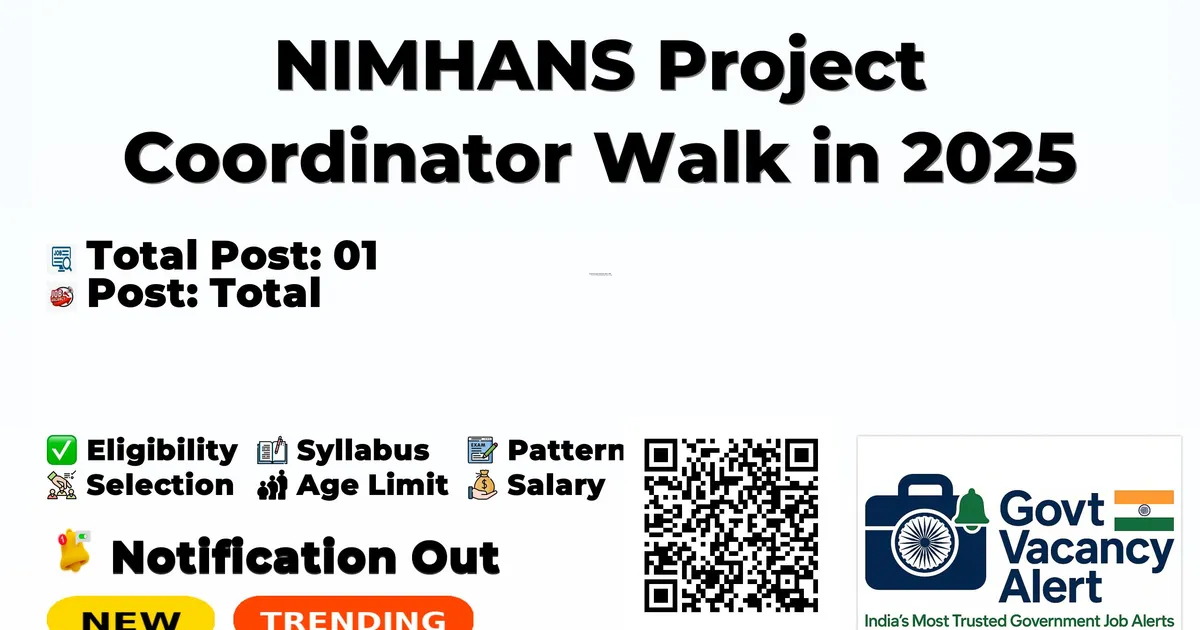 National Institute of Mental Health and Neuro Science (NIMHANS) Recruitment 2025 for 01 posts of Project Coordinator. Candidates with MBBS, M.Sc, M.Phil/Ph.D, MS/MD, MPH Can attend the walkin. The Walk-in interview on 17-11-2025. For detailed information please visit NIMHANS official website, nimhans.ac.in.
