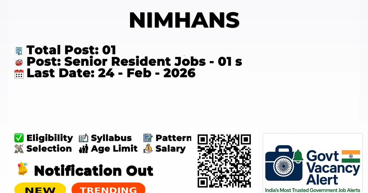 National Institute of Mental Health and Neurosciences (NIMHANS) has declared the official notification for 2026. To fill up the vacancies for Senior Resident Jobs. Those candidates who have qualified in the MD/ MS and DNB can grab this chance and apply for the NIMHANS Recruitment 2026. Here we include the age limit, selection process, salary structure, education details, application fee, and how to apply for these posts. Interested candidates can attend the walk-in at the address given below.