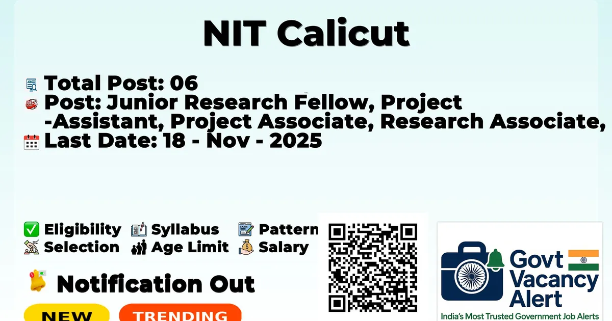 National Institute of Technology Calicut (NIT Calicut) has declared the latest job notification for 2025. To fill up the 06 vacancies for Junior Research Fellow, Project Assistant, Project Associate, Research Associate, and Senior Research Fellow Jobs. Those candidates who have qualified in Any Degree, B.Sc, Diploma, Post Graduation, MD/ MS, MDS, Ph.D can grab this chance and apply for the NIT Calicut Notification 2025. Here, we include the age limit, selection process, salary structure, education details, application fee, and how to apply for these posts. Interested and eligible candidates can apply online before the last date.