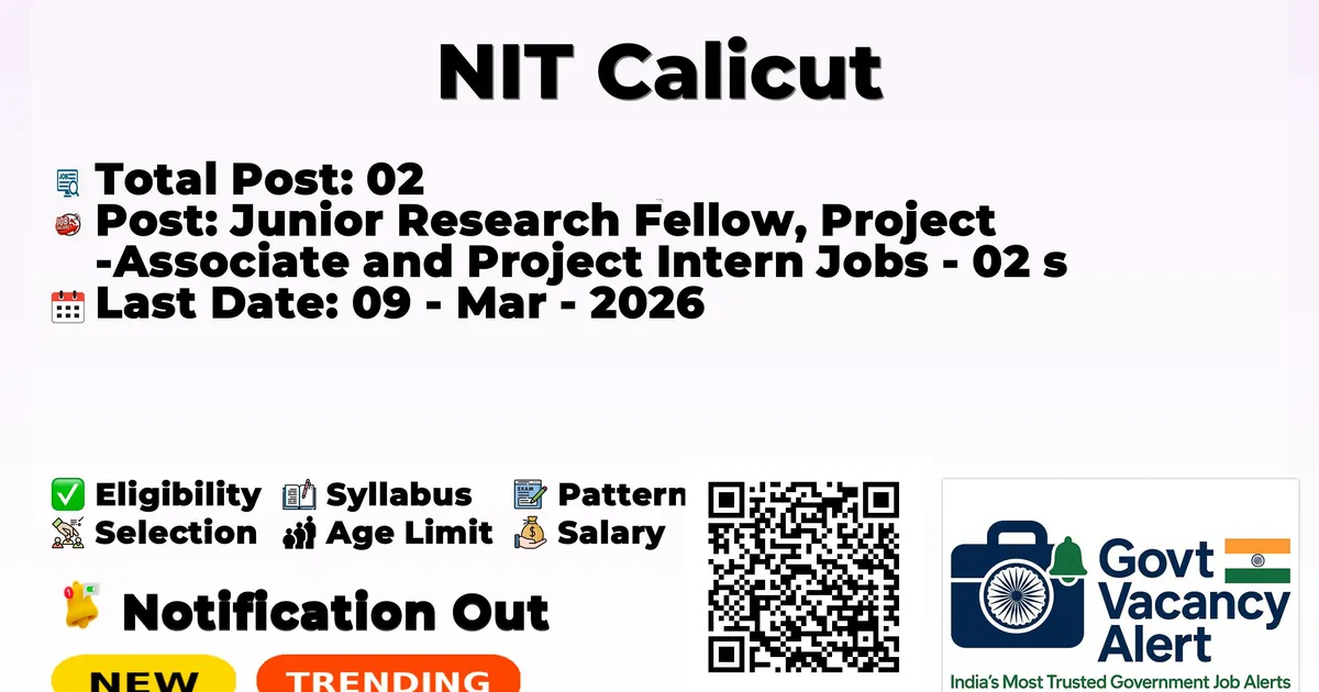 National Institute of Technology Calicut (NIT Calicut) Recruitment 2026 for 02 Junior Research Fellow, Project Associate, and Project Intern Jobs. Candidates who have qualified in the B.E/ B.Tech in Computer Science Engineering can grab this chance and apply for the NIT Calicut Recruitment 2026. Here, we included the age limit, selection process, salary structure, education details, application fee, and how to apply for these posts. Interested and eligible candidates can apply before the last date of application.