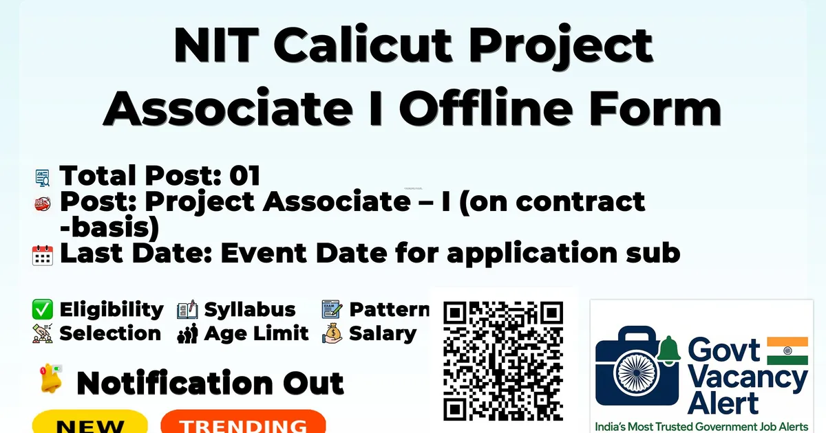 National Institute of Technology Calicut (NIT Calicut) has released an official notification for the recruitment of 01 Project Associate I Posts. Interested and eligible candidates can apply Offline through the official NIT Calicut website. The last date to submit the application form is 04-12-2025. In this article, you’ll find the NIT Calicut Project Associate I Posts recruitment details, including eligibility criteria, age limit, salary structure, selection process, application steps, and direct links to the official notification and Offline application form.