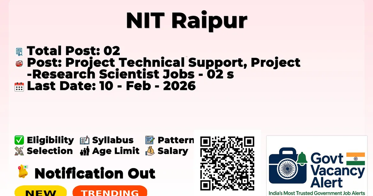 The National Institute of Technology Raipur (NIT Raipur) has officially released the notification to fill the vacancies of 02 Project Technical Support and Project Research Scientist Jobs. Interested and eligibile candidates can use this opportunity to apply for these posts before the last date of application. Candidates who have completed their B.E./B. Tech, M.E./M. Tech in Mechanical Engineering, Ph.D., can apply for the NIT Raipur Jobs 2026. The interested applicants can apply in offline mode. Here we have mentioned the education details, age limit, selection process, application fee, salary, and how to apply for these posts before the deadline. The application dates have already begun.