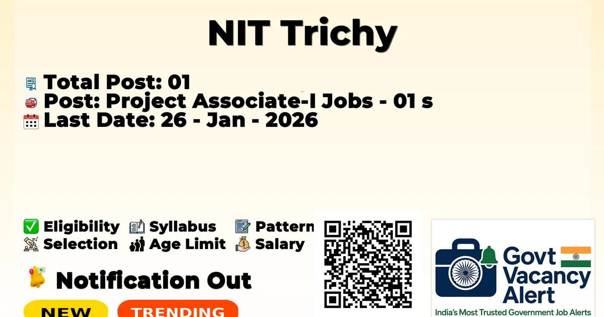 The National Institute of Technology Tiruchirappalli (NIT Trichy) has officially released the notification to fill the vacancies of 01 Project Associate I Posts. Interested and eligibile candidates can use this opportunity to apply for these posts before the last date of application. Candidates who have completed their B.E./B. Tech, M.E./M. Tech can apply for the NIT Trichy Jobs 2026. The interested applicants can apply in offline mode. Here we have mentioned the education details, age limit, selection process, application fee, salary, and how to apply for these posts before the deadline. The application dates have already begun.