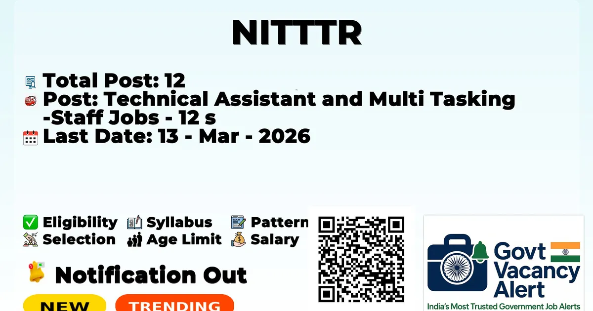 National Institute of Technical Teachers Training and Research, Chennai (NITTTR Chennai) has announced the official notification for 2026. To fill up the vacancies for 12 Technical Assistant and Multi-Tasking Staff Jobs. Those candidates who have qualified in the B.E/ B.Tech, Diploma in Civil Engineering, 10th Pass, and Diploma can grab this chance and apply for the NITTTR Chennai Notification 2026. Here we provided more details about the age limit, selection process, salary structure, education details, application fee, and how to apply for these posts.