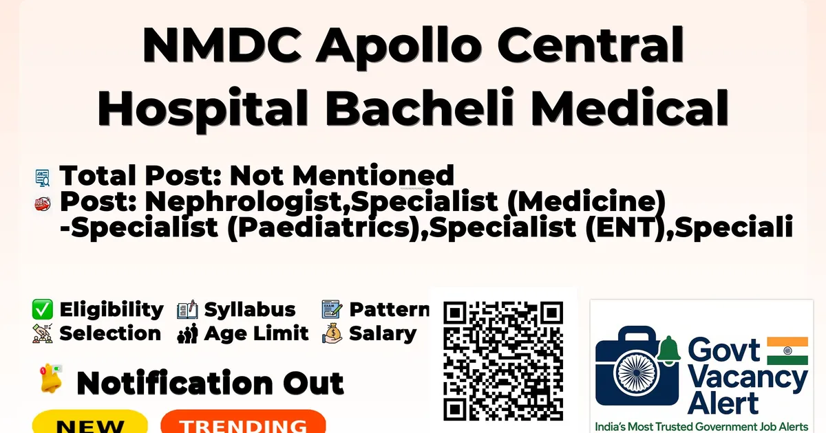 NMDC Apollo Central Hospital Bacheli Recruitment 2025 for posts of Medical Professionals. Candidates with MBBS, DNB, MS/MD, DM Can attend the walkin. The Walk-in starts from 18-09-2025, and ends on 21-09-2025. For detailed information please visit NMDC Apollo Central Hospital Bacheli official website, nmdc.co.in.