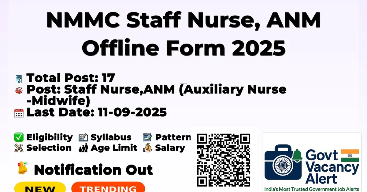 The Navi Mumbai Municipal Corporation (NMMC) Recruitment 2025 for 17 posts of Staff Nurse, ANM. Candidates with B.Sc, GNM, ANM Can Apply Offline. The Offline application opens on 26-08-2025, and closes on 11-09-2025. The candidate shall apply Offline through NMMC website, nmmc.gov.in.