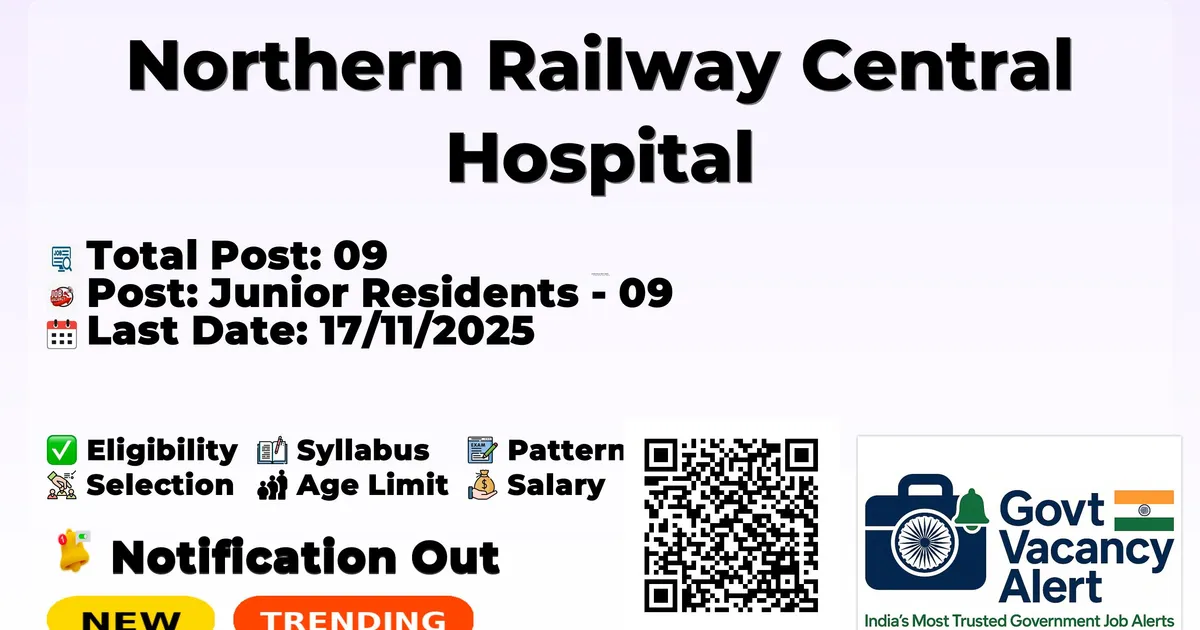 Railway Recruitment Cell Northern Railway (RRC NR) invites applications from eligible Medical professionals for engagement as Junior Residents on contract basis in Northern Railway Central Hospital, New Delhi. Eligible candidates attend WALK-IN Interview on 17th November 2025. Specialty No of Posts General Medicine 04 General Surgery 02 Obst & Gynae 02 Orthopedics 01 Refer to the Official Notification
