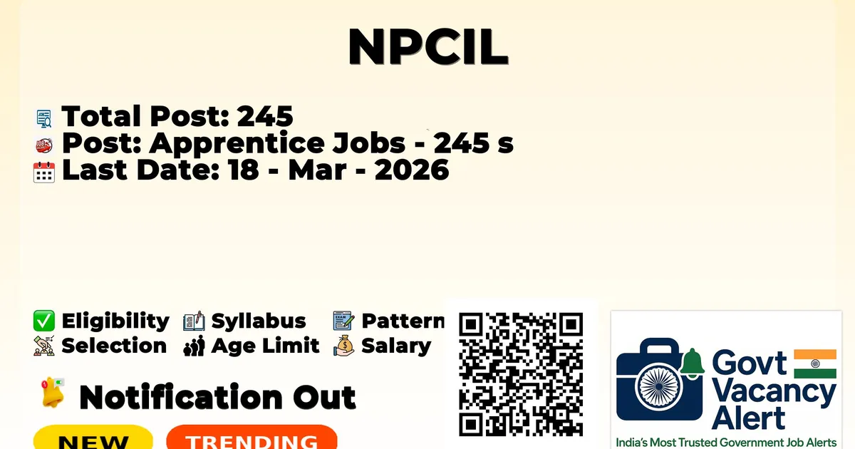 Nuclear Power Corporation of India Limited (NPCIL) has declared the official notification for 2026. To fill up the 245 vacancies for Apprentice Jobs. Those candidates who have qualified in the ITI can grab this chance and apply for the NPCIL Recruitment 2026. Here we included the age limit, selection process, and salary structure, education details, application fee, and how to apply for these posts. Interested candidates can apply before the last date of application.