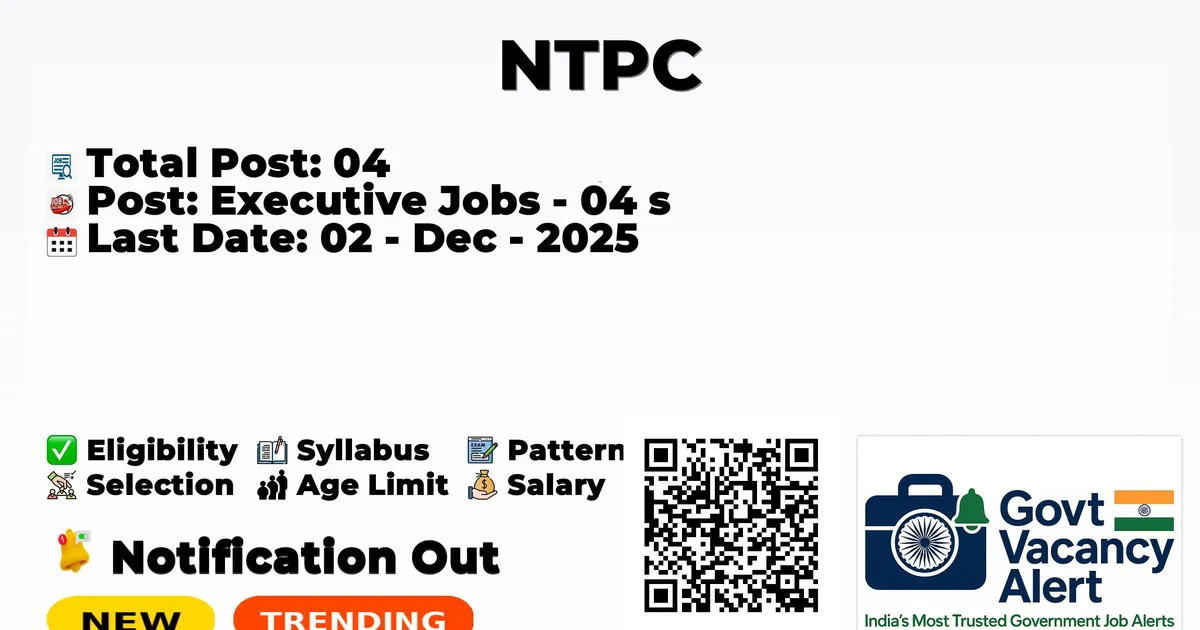 National Thermal Power Corporation (NTPC) has announced the official notification for 2025. To fill up the 04 vacancies for Executive Jobs. Those candidates who have qualified in the B.E/ B.Tech., MBA, and Post Graduation can grab this and apply for the NTPC Recruitment 2025. Here we include the age limit, selection process, salary structure, education details, application fee, and how to apply for these posts. Interested candidates can apply before the specified last date.