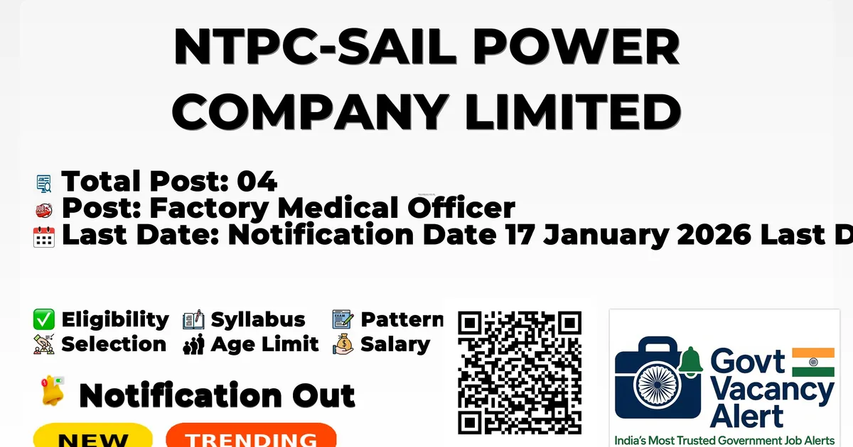 Company Name NTPC-SAIL POWER COMPANY LIMITED (NSPCL) Post Name Factory Medical Officer No of Posts 04 Salary Rs. 1,23,000/- per month Qualification MBBS with AFIH Age Limit Maximum 64 years Start Date 17 January 2026 Last Date 26 January 2026 Official Website https://www.nspcl.co.in/