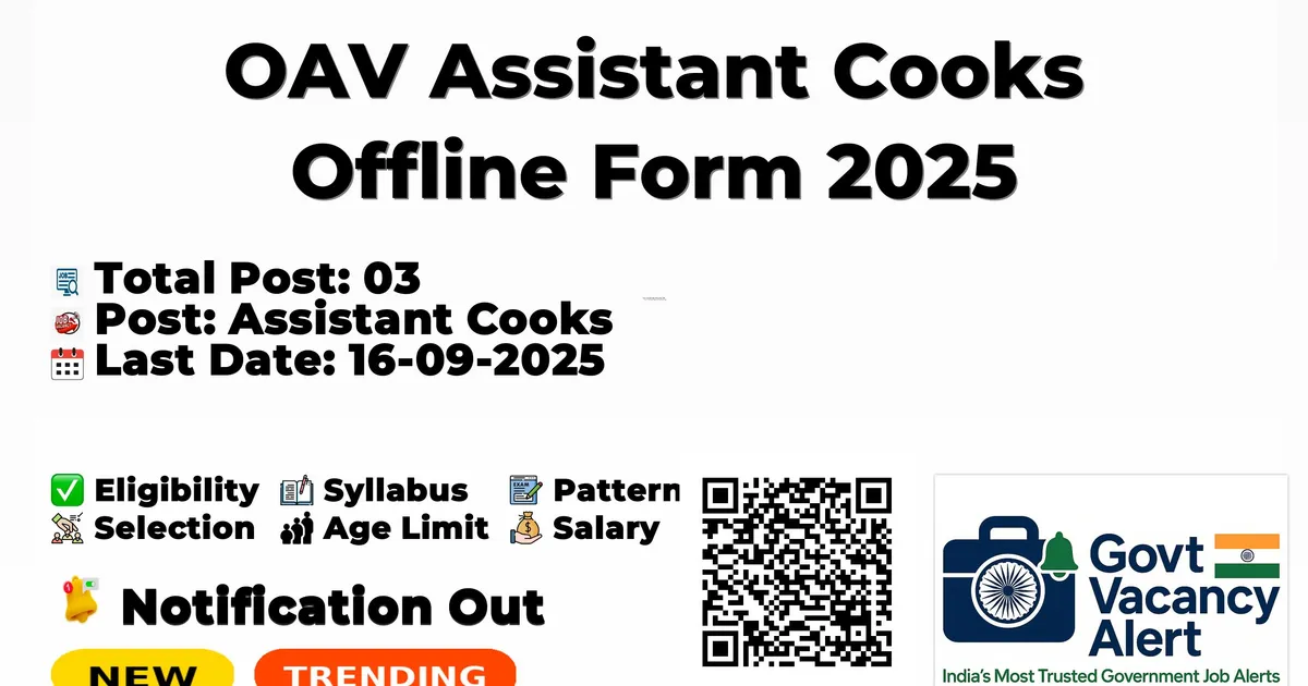 The Odisha Adarsha Vidyalaya (OAV) Recruitment 2025 for 03 posts of Assistant Cooks. Candidates with 10TH, 9th Can Apply Offline. The Offline application opens on 11-09-2025, and closes on 16-09-2025. The candidate shall apply Offline through OAV website, rayagada.odisha.gov.in.