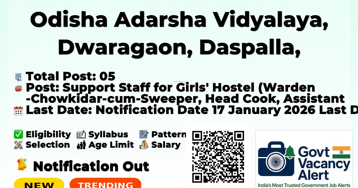 Odisha Adarsha Vidyalaya Dwaragaon Daspalla (OAV Dwaragaon Daspalla) has released an official notification for the recruitment of 05 Warden, Head Cook And More Posts. Interested and eligible candidates can apply Offline through the official OAV Dwaragaon Daspalla website. The last date to submit the application form is 31-01-2026. In this article, you’ll find the OAV Dwaragaon Daspalla Warden, Head Cook And More Posts recruitment details, including eligibility criteria, age limit, salary structure, selection process, application steps, and direct links to the official notification and Offline application form.