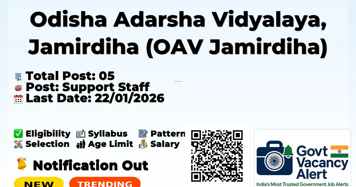 Company Name Odisha Adarsha Vidyalaya, Jamirdiha (OAV Jamirdiha) Post Name Support Staff No of Posts 05 Advt No 2026/OAV/012 Salary Rs 6750 to 21175 Qualification B.A. / B.Sc. from recognised university for Warden; HSC Examination from recognised board for Chowkidar-cum-Sweeper Age Limit 21 to 60 years Last Date for Apply 22/01/2026 Official Website mayurbhanj.odisha.gov.in