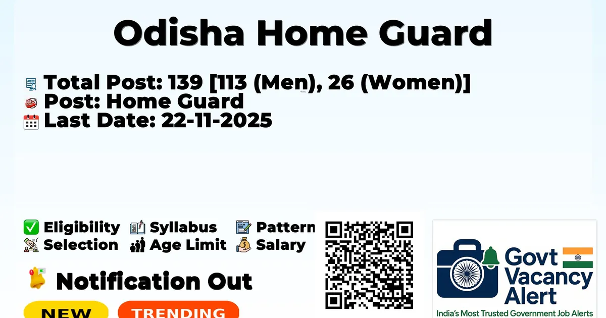 Odisha Home Guard has released an official notification for the recruitment of 139 Home Guard Posts. Interested and eligible candidates can apply Offline through the official Odisha Home Guard website. The last date to submit the application form is 22-11-2025. In this article, you’ll find the Odisha Home Guard Posts recruitment details, including eligibility criteria, age limit, salary structure, selection process, application steps, and direct links to the official notification and Offline application form. Join Arattai Channel Trending Govt Jobs KVS and NVS 14967 Teaching and Non Teaching Online Form 2025 SAIL 124 Management Trainee (Tech) Online Form 2025 RRB NTPC 5,810 Online Form 2025 Bank of Baroda 2700 Apprentices Online Form 2025 Intelligence Bureau (IB) ACIO II Tech Online Form 2025 Advertisement Company Name Odisha Home Guard Post Name Home Guard No of Posts 139 [113 (Men), 26 (Women)] Qualification 5th Age Limit 20 to 60 years Start Date for Apply 13-11-2025 Last Date for Apply 22-11-2025 Official Website bhadrak.odisha.gov.in Applicant must have passed the L.P. Standard (Lower Primary Fifth Grade) examination conducted by the School and Mass Education Department. Minimum Age Limit: 20 Years Maximum Age limit: 60 Years Age relaxation is applicable as per rules. Candidates Kindly Refer to the Official Notification Starting Date for Apply: 13-11-2025 Last Date for Apply: 22-11-2025 Applications must be submitted in person at the District Home Guard Office in Bhadrak between November 13, 2025, and November 22, 2025. Applications sent by post, or those that are incomplete or received after the deadline, will not be considered. Candidates can apply for general Home Guard roles or specific skilled positions such as Housekeeping, Driving, Computer, Electrician, Cook, Laundry, Barber, Plumber, AC Mechanic, Carpenter, or Gardener. Successful candidates will generally be assigned to vacant positions within their local police station areas, but may be assigned to neighboring stations or the district headquarters if needed. Official Notification PDF: Click here Official Website: Click here Join Arattai Channel: Click Here Join Telegram Channel: Click Here Join WhatsApp Channel: Click Here Sarkari Result: Click Here Download Mobile App: Click Here Jobs In Odisha Anugul Balangir Baleshwar Bargarh Baudh Bhadrak Bhubaneshwar Cuttack Debagarh Dhenkanal Gajapati Ganjam Jagatsinghapur Jajapur Jharsuguda Kalahandi Kandhamal Kendrapara Kendujhar Khordha Koraput Malkangiri Mayurbhanj Nabarangapur Nayagarh Nuapada Paradeep Puri Rayagada Rourkela Sambalpur Subarnapur Sundargarh Also Read SEBI Recruitment 2025 - Officer Grade A (Assistant Manager) Vacancies - Rs 62500 to 126100 Salary - Apply Now Intelligence Bureau ACIO II Tech Recruitment 2025 - 200+ Vacancies Across India - 44900-142400 Salary - Apply Now RRB Recruitment 2025 - 2500+ JE (Junior Engineer) Vacancies - 35400 Monthly Salary - Apply Now Jobs By Education 10TH Jobs› 8TH Jobs› 12TH Jobs› Diploma Jobs› ITI Jobs› B.Tech/B.E Jobs› B.com Jobs› Any Graduate Jobs› Any Post Graduate Jobs› KVS and NVS 14967 Teaching and Non Teaching Online Form 2025 Bank of Baroda 2700 Apprentices Online Form 2025 RRB 2569 JE (Junior Engineer) Online Form 2025 RRB NTPC 12TH Level Online Form 2025 3058 Post BRO 542 MSW, Vehicle Mechanic Offline Form 2025 Territorial Army 1529 Soldier Offline Form 2025 ONGC 2623 Apprentices Online Form 2025 BSSC 23175 Inter Level Online Form 2025 ISRO SDSC SHAR Various Vacancy Online Form 2025 1. What is the starting date to apply for Odisha Home Guard 2025? Ans: Starting Date to apply is 13-11-2025. 2. What is the last apply date for Odisha Home Guard 2025? Ans: Last apply date is 22-11-2025. 3. What is the Eligibility to apply for Odisha Home Guard 2025? Ans: 5th 4. What is the Maximum Age Limit to apply for Odisha Home Guard 2025? Ans: 60 Years 5. How many vacancies are being recruited by Odisha Home Guard 2025? Ans: Total 139 Vacancies.