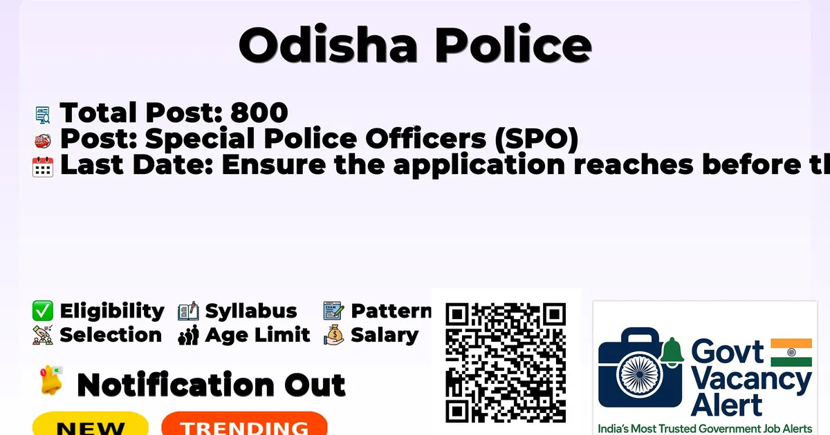 Company Name Odisha Police Post Name Special Police Officers (SPO) No of Posts 800 Salary As per Government of Odisha, Finance Department Memo No.24533/F dtd 22.09.2022 Qualification Retired Asst. Sub-Inspectors/ Sub-Inspectors/ Inspectors of Police Age Limit Max: 65 years Last Date 30-03-2026 Apply Mode Offline Job Type Contract