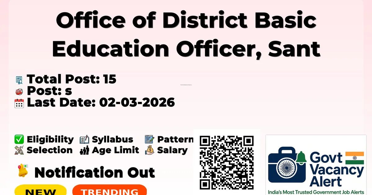 Company Name Office of District Basic Education Officer, Sant Kabir Nagar, Uttar Pradesh Post Name Teaching and Non-Teaching Posts No of Posts 15 Qualification Graduation in relevant subject, NCTE recognized B.Ed / LT, Upper Primary TET, B.P.Ed / C.P.Ed / D.P.Ed, Class 8th pass Age Limit 25-45 years as on 01-04-2026 Salary Rs. 6,755/- to Rs. 25,410/- Per Month Start Date for Apply Offline 14-02-2026 Last Date for Apply Offline 02-03-2026 Application Mode Offline Job Type Contractual Official Website sknagar.nic.in