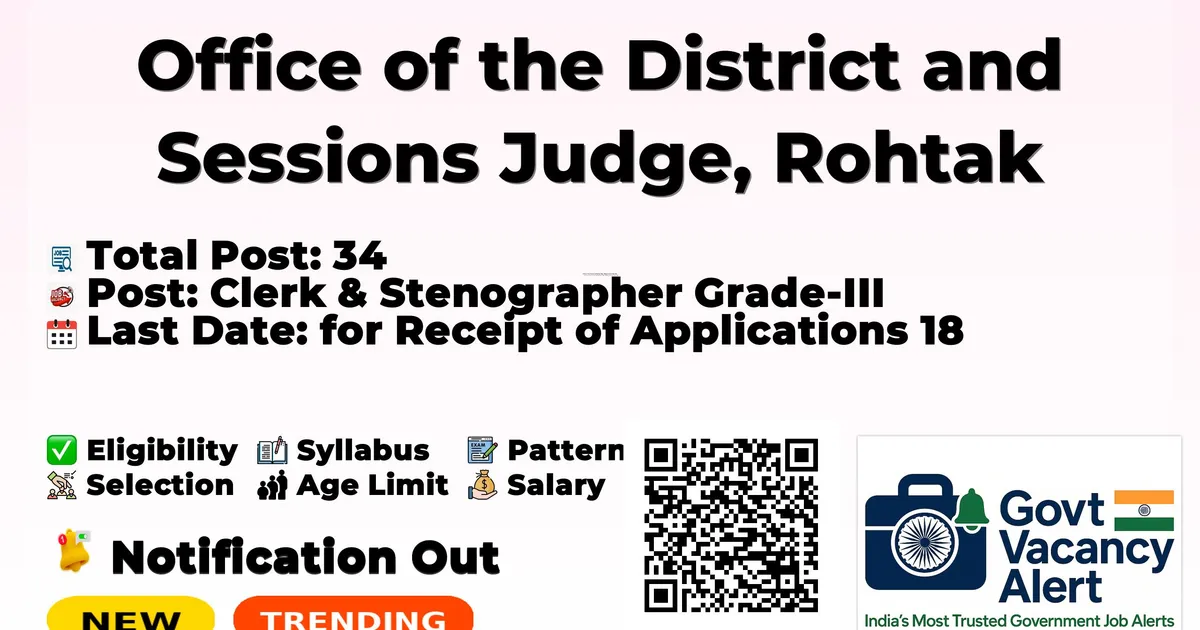 District Court Rohtak has released an official notification for the recruitment of 34 Clerk And Stenographer Grade III Posts. Interested and eligible candidates can apply Offline through the official District Court Rohtak website. The last date to submit the application form is 18-02-2026. In this article, you’ll find the District Court Rohtak Clerk And Stenographer Grade III Posts recruitment details, including eligibility criteria, age limit, salary structure, selection process, application steps, and direct links to the official notification and Offline application form.
