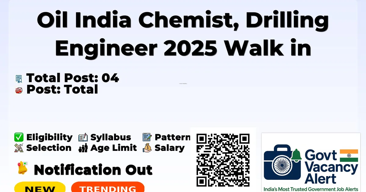 Oil India Recruitment 2025 for 04 posts of Chemist, Drilling Engineer. Candidates with B.Tech/B.E, M.Sc Can attend the walkin. The Walk-in interview on 13-11-2025. For detailed information please visit Oil India official website, oil-india.com.