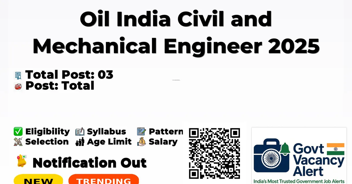 Oil India Recruitment 2025 for 03 posts of Civil and Mechanical Engineer. Candidates with B.Tech/B.E Can attend the walkin. The Walk-in on 27-11-2025. For detailed information please visit Oil India official website, oil-india.com.