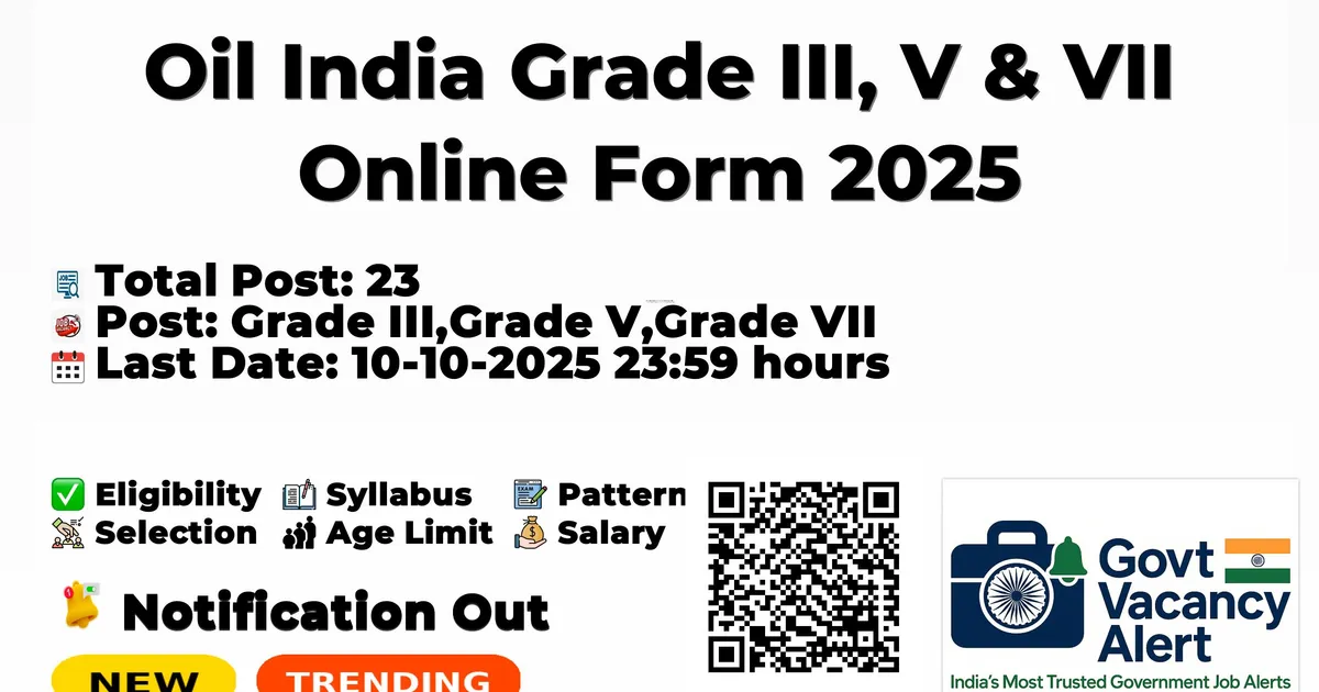 The Oil India Recruitment 2025 for 23 posts of Grade III, V & VII. Candidates with Any Graduate, B.Com, Diploma, ITI, 12TH Can Apply Online. The online application opens on 10-09-2025, and closes on 10-10-2025. The candidate shall apply online through Oil India website, oil-india.com.