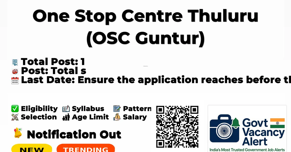 One Stop Centre Thuluru (OSC Guntur) has released the OSC Guntur Para Legal Personnel/Lawyer Recruitment 2026 notification for 1 Para Legal Personnel/Lawyer post on a contractual basis to provide legal assistance and support services under the One Stop Centre initiative.