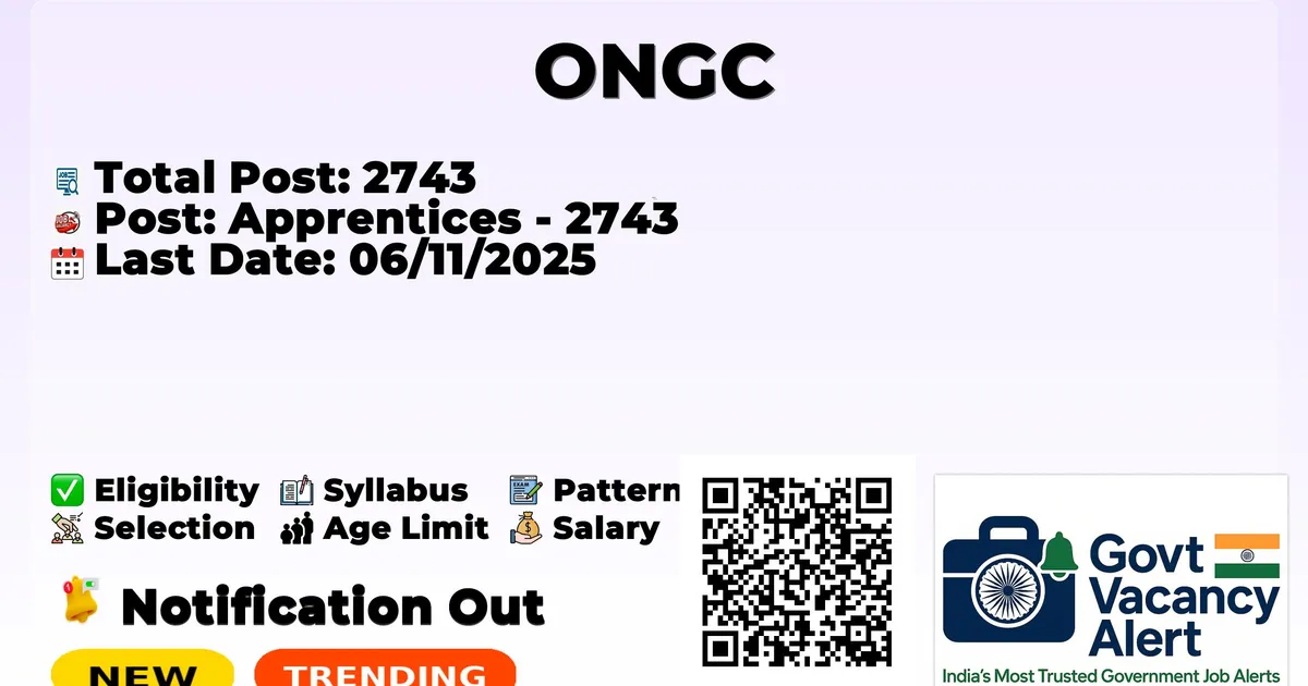 ONGC Apprentice 2025-26 @ ongcapprentices.ongc.co.in: The Oil and Natural Gas Corporation Limited (ONGC), Office of Head of Institute and Skill Development Centre (Delhi/ Mumbai/ Vadodara/ Sivasagar/ Chennai) invites online applications for engagement of Apprentices under Apprentices Act 1961 (as amended from time to time) in various trades / disciplines at ONGC location across 25 work centers. In this year, ONGC released apprentice notification of 2743 posts for Fresher ITI, Diploma and Graduates of recent year pass out. www.indgovtjobs.in Name of Post Apprentices (Apprenticeship) Total Vacancies 2743 Age Limit 18 to 24 years Monthly Stipend ₹ 8200 to ₹ 12300/- Qualification Degree, Diploma, ITI, 10th 12th Pass Selection Process Merit List Job Location 25 ONGC Works Centre - Across India Last Date 6th November 2025 Sector – Total Posts Locations Breakdown Western Sector - 856 Posts Cambay - 48, Vadodara - 76, Ankleshwar - 288, Ahmedabad - 232, Mehsana - 212 Eastern Sector - 578 Posts Nazira & Sivasagar - 370, Silchar - 73, Jorhat - 135 Mumbai Sector - 569 Posts Mumbai - 352, Panvel - 15, Nhava - 18, Goa - 32, Hazira - 77, Uran - 75 Central Sector - 253 Posts Bokaro - 27, Kolkata - 26, Agartala - 200 Southern Sector - 322 Posts Karaikal - 153, Rajahmundry - 53, Kakinada - 76, Chennai - 40 Northern Sector - 165 Posts Dehradun - 120, OVL Delhi - 20, Delhi - 19, Jodhpur - 06 Dehradun, Delhi, OVL Delhi, Jdhpur, Goa, Hazira, Mumbai, Panvel, Nhava, Uran, Ahmedabad, Ankleshwar, Vadodara, Cambay, Mehsana, Jorhat, Chennai, Nazira & Sivasagar, Silchar, Kakinada, Karaikal, Rajashmundry, Agartala, Kolkata. Minimum 18 years and maximum 24 years as on 6th November 2025. The Date of Birth of the Candidate/Applicant should between 06.11.2001 and 06.11.2007. Age Relaxation: 05 years for SC / ST, 03 years for OBC, Plus 10 years for PwBD categories. Graduate Apprentice (B.A / B.Com / B.Sc / B.B.A / B.E. / B.Tech) - ₹ 12,300/- per month Trade Apprentices (10th / 12th) - ₹ 8,200/- per month Trade Apprentices (1 year ITI) - ₹ 9,600/- per month Trade Apprentices (2 year ITI) - ₹ 10,560/- per month Diploma Apprentices (03 years) - ₹10,900/- per month