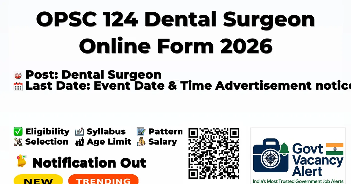 Odisha Public Service Commission (OPSC) has announced the OPSC Dental Surgeon Recruitment 2026 for a total of 124 vacancies (including 41 women) for the post of Dental Surgeon in Group-A (Junior Branch) of Odisha Medical Services (Dental) Cadre under the Health & Family Welfare Department. Candidates having BDS or equivalent degree and a valid registration under the Dentist Act, 1948 can check the vacancy details, eligibility criteria, selection process, exam pattern, salary, age limit, and important dates before applying online through the official website.