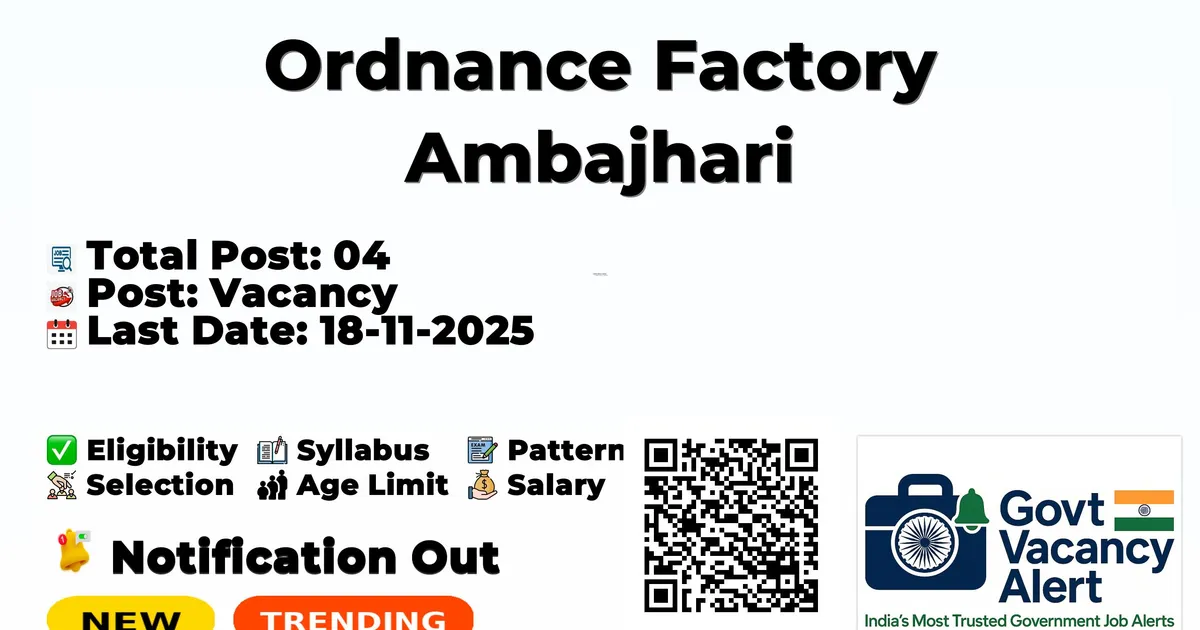 Ordnance Factory Ambajhari has released an official notification for the recruitment of 04 LWO, Executive and More Posts. Interested and eligible candidates can apply Offline through the official Ordnance Factory Ambajhari website. The last date to submit the application form is 18-11-2025. In this article, you’ll find the Ordnance Factory Ambajhari LWO, Executive and More Posts recruitment details, including eligibility criteria, age limit, salary structure, selection process, application steps, and direct links to the official notification and Offline application form.