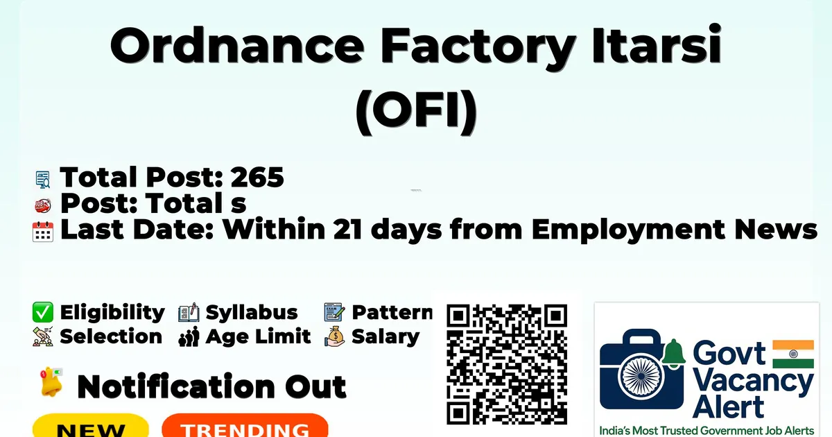 Ordnance Factory Itarsi has released an official notification for the recruitment of 265 Tenure Based CPW Posts. Interested and eligible candidates can apply Offline through the official Ordnance Factory Itarsi website. In this article, you’ll find the Ordnance Factory Itarsi Tenure Based CPW Posts recruitment details, including eligibility criteria, age limit, salary structure, selection process, application steps, and direct links to the official notification and Offline application form.