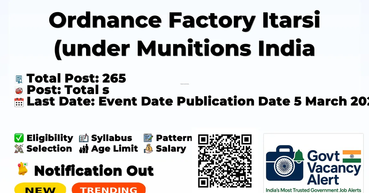 Company Name Ordnance Factory Itarsi (under Munitions India Limited) Post Name Tenure Based CPW (Chemical Process Worker) No of Posts 265 Salary Rs. 19900 + DA Qualification National Apprenticeship Certificate (NAC) issued by NCVT, Primary trade: AOCP (Attendant Operator Chemical Plant), Feeder trades: IMCP, MMCP, LACP, PPO, Fitter General, Machinist, Turner, Sheet Metal Worker, Electrician, Electronic Mechanic, Boiler Attendant, Mechanic Industrial Electronics, Refrigeration and Air Conditioning Mechanic Age Limit Min: 18 years, Max: 40 years Last Date 25-03-2026 Apply Mode Offline Job Type Contract