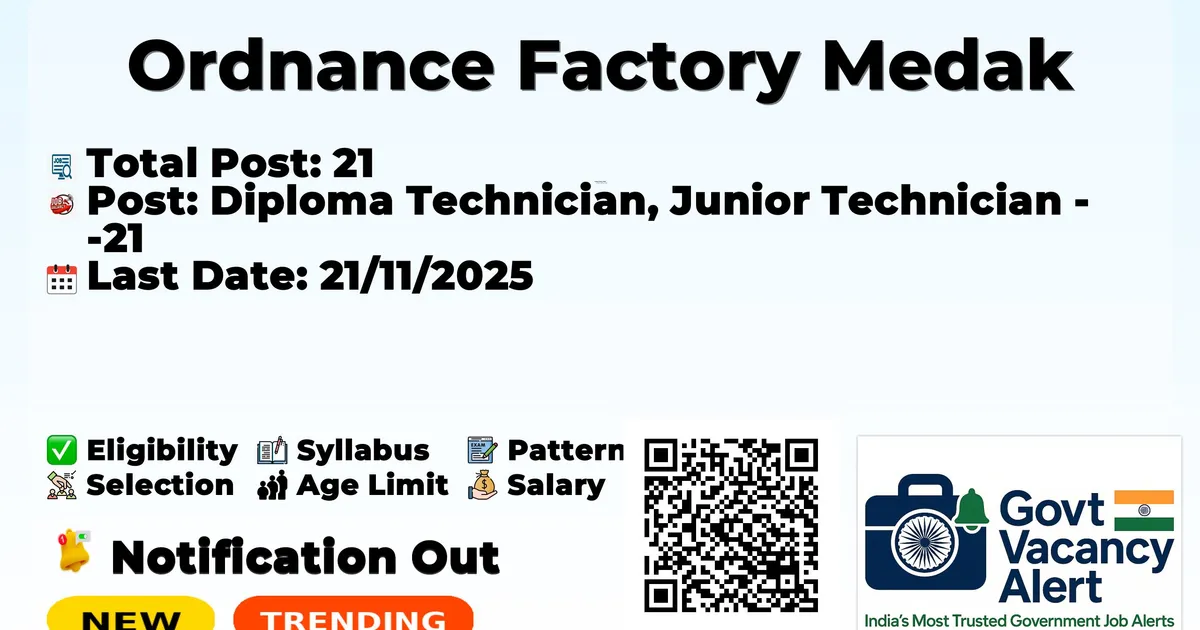 ➢ Step 5: Send the complete application to "The Deputy General Manager/HR, Ordnance Factory Medak, Yeddumailaram, Dist: Sangareddy, Telangana - 502205" by Ordinary Post / Speed Post, to reach on or before 21st November 2025.