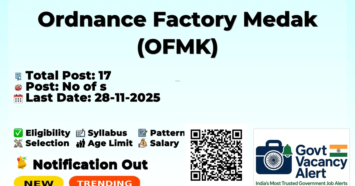 Ordnance Factory Medak (OFMK) has released an official notification for the recruitment of 17 Senior Manager, Junior Manager and More Posts. Interested and eligible candidates can apply Offline through the official OFMK website. The last date to submit the application form is 28-11-2025. In this article, you’ll find the OFMK Senior Manager, Junior Manager and More Posts recruitment details, including eligibility criteria, age limit, salary structure, selection process, application steps, and direct links to the official notification and Offline application form.