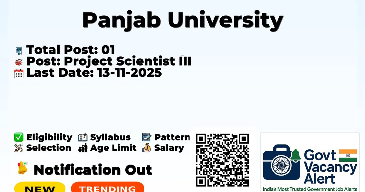 Panjab University has released an official notification for the recruitment of 01 Project Scientist III Posts. Interested and eligible candidates can apply Offline through the official Panjab University website. The last date to submit the application form is 13-11-2025. In this article, you’ll find the Panjab University Project Scientist III Posts recruitment details, including eligibility criteria, age limit, salary structure, selection process, application steps, and direct links to the official notification and Offline application form.