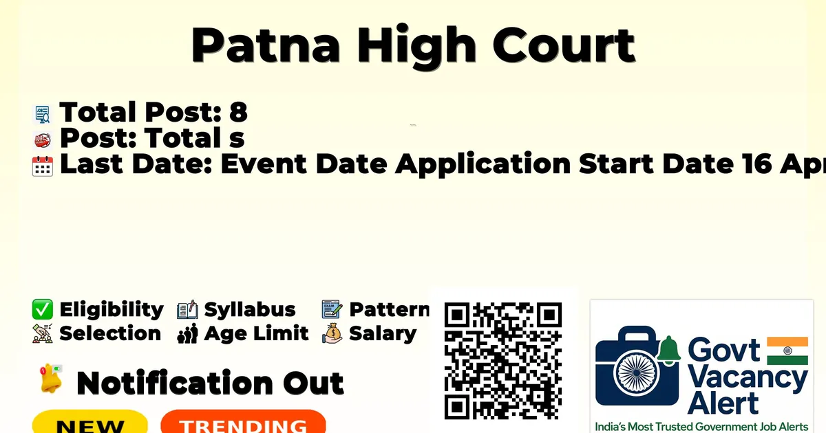 Company Name Patna High Court Post Name District Judge (Entry Level), Direct From Bar Exam-2026 No of Posts 8 Qualification Advocates/Judicial Officers with 7 years of practice or more. Age Limit Min: 35 years, Max: 50 years Last Date 15-05-2026 Apply Mode Online Job Type Permanent