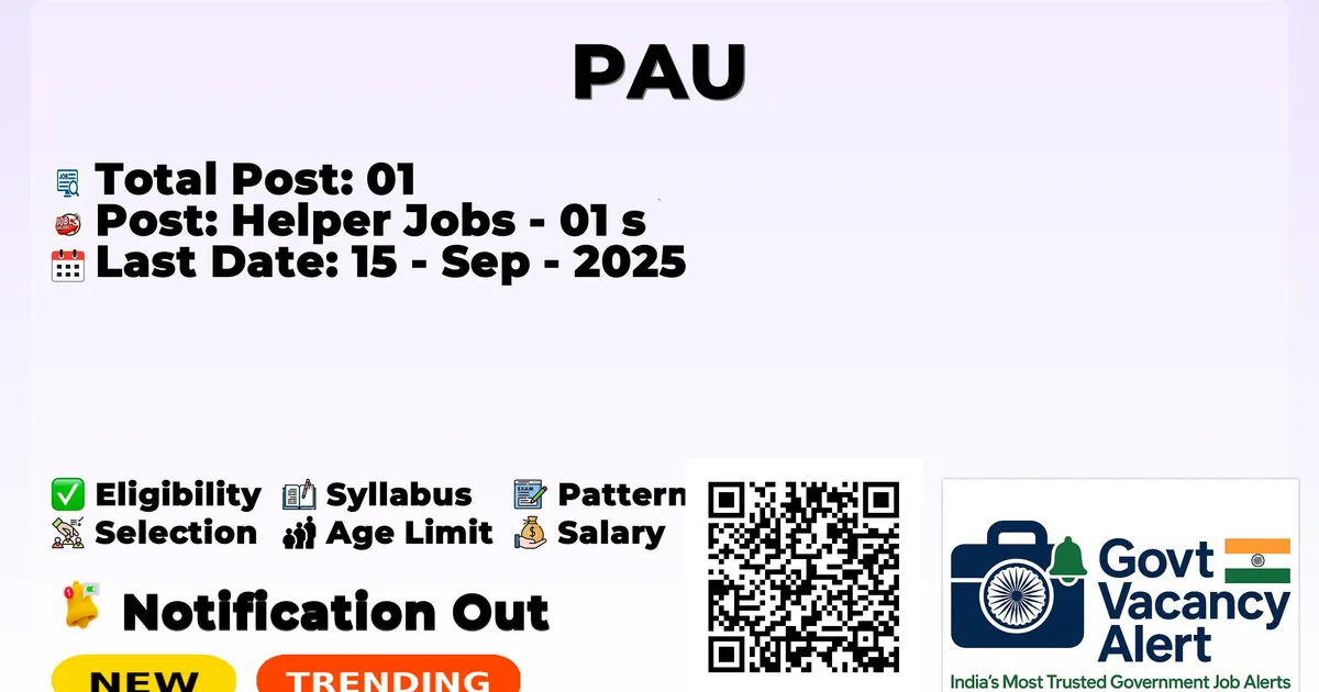 The Punjab Agricultural University (PAU) has announced the official notification for 2025. To fill up the vacancies for Helper Jobs. Those candidates who have qualified in the 10th pass can grab this chance and apply for these posts. Here, we include the age limit, selection process, salary structure, education details, application fee, and how to apply for the PAU Recruitment 2025. Interested and eligible candidates can fill out the application form on or before the last date of application. For more details, visit the official website.