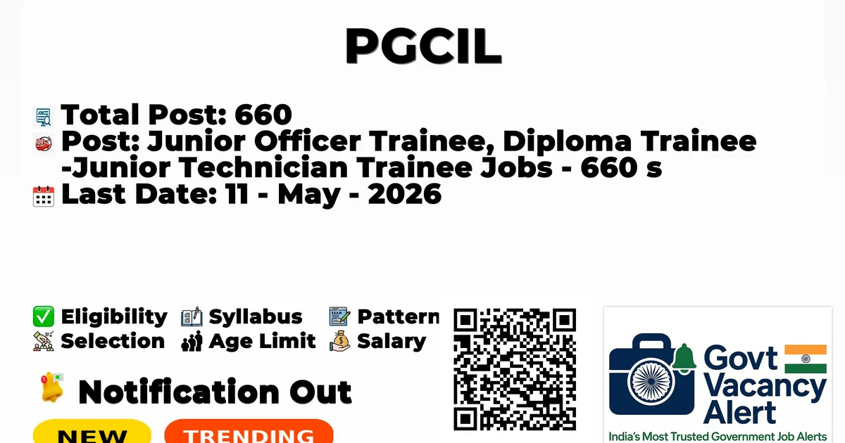 The Power Grid Corporation of India Limited (PGCIL) has officially released the notification to fill the vacancies of 660 Junior Officer Trainee, Diploma Trainee, Junior Technician Trainee Jobs. Interested and eligibile candidates can use this opportunity to apply for these posts before the last date of application. Candidates who have completed their Diploma, B.E./B.Tech in Electrical, Electronics, Civil Engineering, CA, Any degree, B.E./B. Tech, ITI can apply for the PGCIL Notification 2026. The interested applicants can apply in online mode. Here we have mentioned the education details, age limit, selection process, application fee, salary, and how to apply for these posts before the deadline. The application dates have already begun.