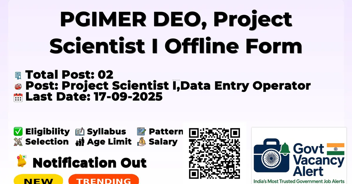 The Postgraduate Institute of Medical Education and Research (PGIMER) Recruitment 2025 for 02 posts of DEO, Project Scientist I. Candidates with Any Graduate, Diploma, M.Phil/Ph.D Can Apply Offline. The Offline application opens on 10-09-2025, and closes on 17-09-2025. The candidate shall apply Offline through PGIMER website, pgimer.edu.in. The PGIMER DEO, Project Scientist I Recruitment 2025 Notification PDF has been released on 11-09-2025 at pgimer.edu.in. Check the complete job details, vacancy, age limit, application fee, selection process and how to apply from the article. You can Check all Latest Sarkari Result Updates of All Central Government Jobs and State Government Jobs. PGIMER DEO, Project Scientist I Recruitment 2025 Notification PDF