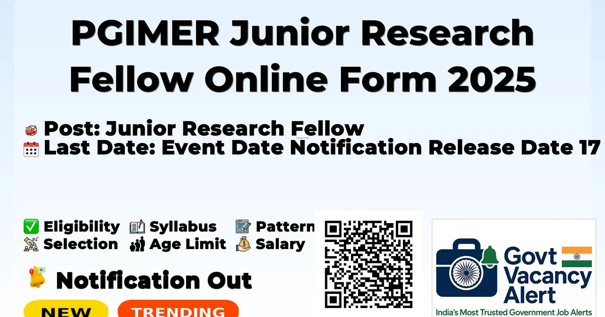 Details Information Organization Name Postgraduate Institute of Medical Education & Research Chandigarh (PGIMER) Post Name Junior Research Fellow Total Vacancies 1 Posts Salary/Pay Scale Rs. 35,960/- (including HRA) Educational Qualification Post Graduate Degree in Professional Courses such as Master in Public Health (MPH) OR Masters in Economics Application Start Date 17/12/2025 Application End Date 29/12/2025 Application Mode Online Official Website https://pgimer.edu.in