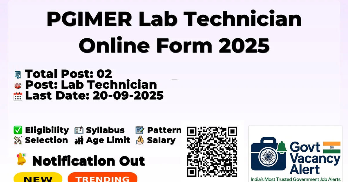 The Postgraduate Institute of Medical Education and Research (PGIMER) Recruitment 2025 for 02 posts of Lab Technician. Candidates with B.Sc, MLT Can Apply Online. The online application opens on 11-09-2025, and closes on 20-09-2025. The candidate shall apply online through PGIMER website, pgimer.edu.in.