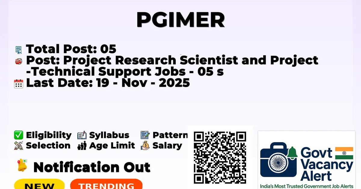Postgraduate Institute of Medical Education and Research (PGIMER) has declared the official notification for 2025. To fill up the vacancies for 05 Project Research Scientists and Project Technical Support Jobs. Those candidates who have qualified in the MDS 10th can grab this chance and apply for the PGIMER Recruitment 2025. Here, we included the age limit, selection process, salary structure, education details, application fee, and how to apply for these posts. Interested and eligible candidates can attend the walk-in at the given venue.