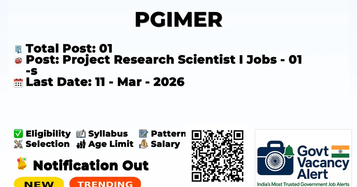 Postgraduate Institute of Medical Education and Research (PGIMER) has released an official notification for the recruitment of various Project Research Scientist I Jobs. Those candidates who have qualified in the Post Graduation can grab this chance and apply for the PGIMER Recruitment 2026. Here we included the age limit, selection process, salarystructure, education details, application fee, and how to apply for these posts.
