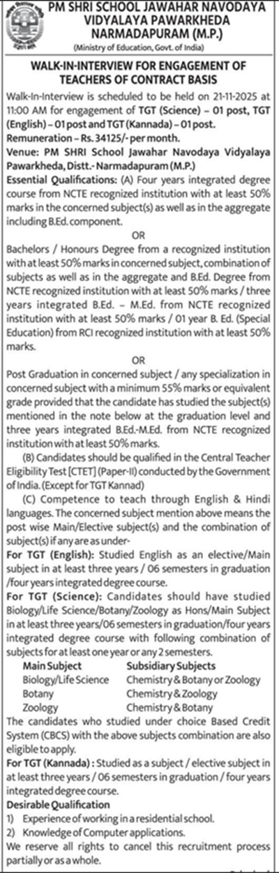 Address – PM SHRI School Jawahar Navodaya Vidyalaya Pawarkheda, Distt.-Narmadapuram (M.P.).