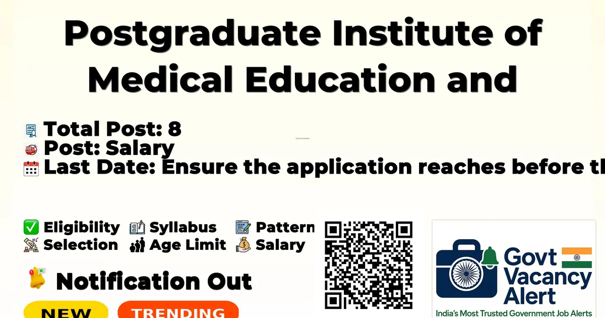 Postgraduate Institute of Medical Education and Research (PGIMER) has released an official notification for the recruitment of 8 Project Research Scientist I (Medical) Posts. Interested and eligible candidates can apply Offline by sending the application form to the official address. The last date to submit the application is 06-03-2026.